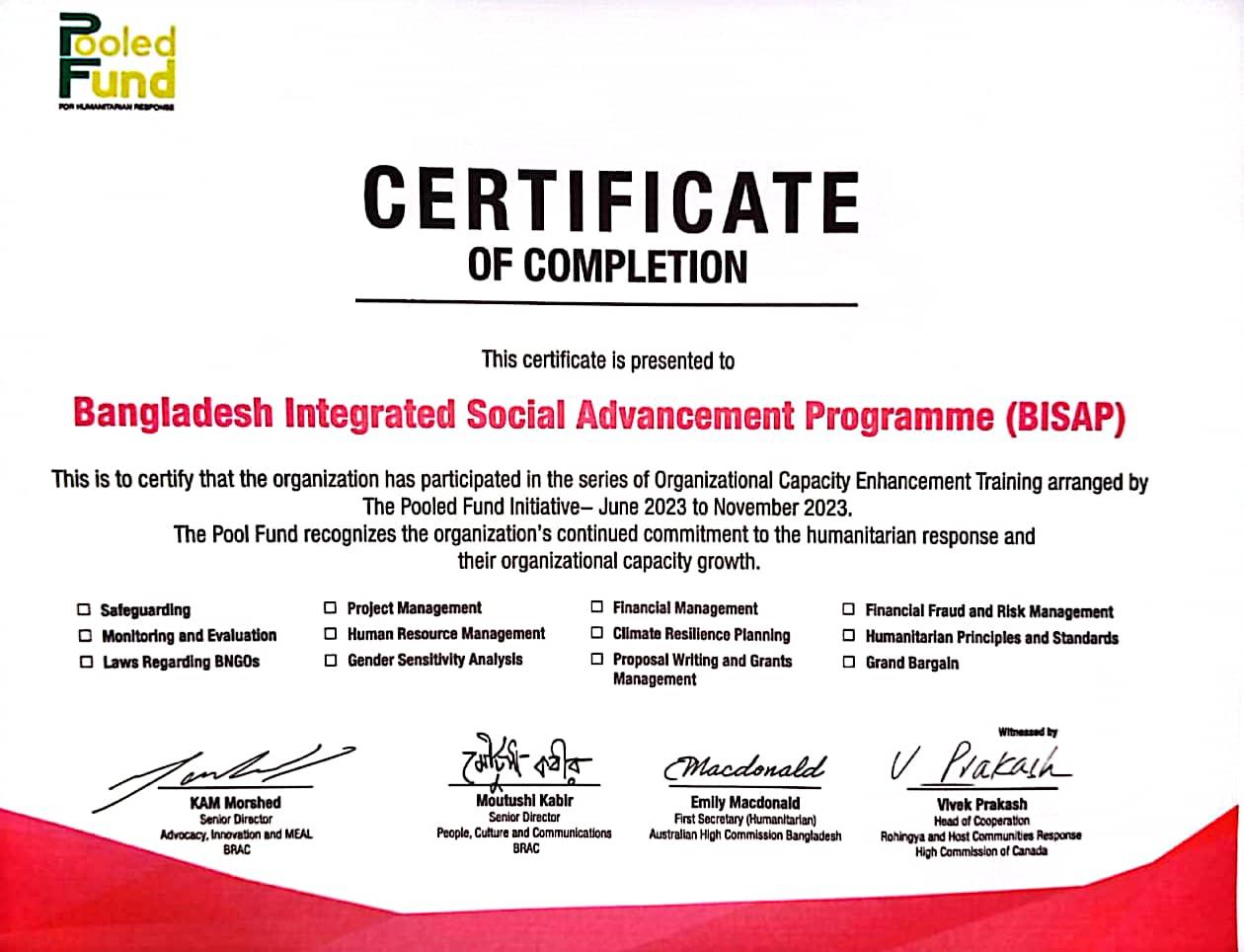 BISAP is registered with NGO Affairs Bureau, Government of Bangladesh under Foreign Donation (Voluntary Activities) Regulation Rules, 1978 having Reg. No. FD/R -659 dated 22.10.1992 and Renewed till 21/10/2027.